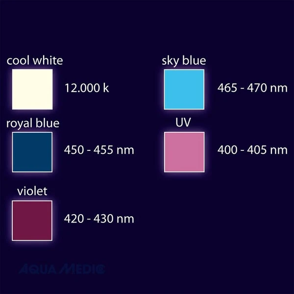 LED Cluster Chip bestehend aus 24 einzelnen LED-Elementen mit ausgewogenem Lichtspektrum. Mit Hohe Energiedichte speziell abgestimmt für starkes Korallenwachstum (PAR=1.250 µmol m-2s-1). Die Farbe und Lichtmenge ist über 2 Kanäle manuell einstellbar. Der integrierte 0-10 Volt Anschluss ist zur Verwendung von externen Steuergeräten gedacht. Die kompakte Bauweise ermöglicht eine ideale Beleuchtung von Nano-Aquarien sowie die Ausleuchtung dunkler Randbereiche bei größeren Aquarien. Der Laufruhige interne Lüfter ist für zuverlässige Kühlung des High Power LED Chips konzipiert. Ein flexibler Schwanenhals sorgt für einen stabilen Halt und einfache Ausrichtung sowie Stahlseilaufhängung zur Deckenmontage (im Lieferumfang enthalten).