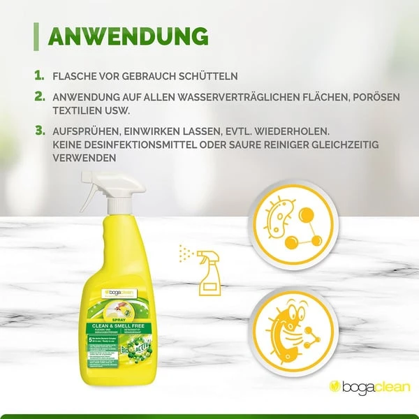 Schlechte Gerüche entstehen beim Abbau von organischem Material durch Bakterien. Dadurch bilden sich übelriechende Gase, Schwefelverbindungen und Ammoniak (Kot, Urin, Erbrochenes, Reviermarkierungen, Inkontinenz usw.). bogaclean CLEAN & SMELL FREE ist ein hocheffizientes Reinigungsmittel, welches unangenehme, organische Gerüche tiefenwirksam, mikrobiologisch und nachhaltig eliminiert. Den geruchsbildenden Keimen wird der Nährboden entzogen, wodurch schlechter Geruch und erneutes Reviermarkieren verhindert wird.
