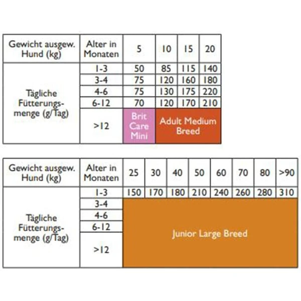 Verteil die empfohlene Tagesration laut Fütterungstabelle in 3-5 gleiche Portionen am Tag. Trocken oder mit lauwarmem Wasser eingeweicht servieren. Die tägliche Fütterungsmenge kann abhängig von der Umgebung, Aktivität und vom Alter deines Hundes variieren. Stelle sicher, dass dein Hund ausreichend frisches Wasser zum Trinken zur Verfügung hat. Wenn du Brit Care zum ersten Mal fütterst, vermisch es mit dem gewohnten Futter und erhöhe in den nächsten 7 Tagen schrittweise den Anteil von Brit Care. Bitte kühl und trocken lagern, vor direkter Sonneneinstrahlung schützen und den Beutel nach dem dem Öffnen stets wieder schließen.