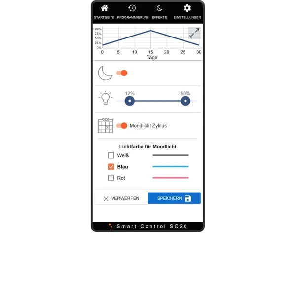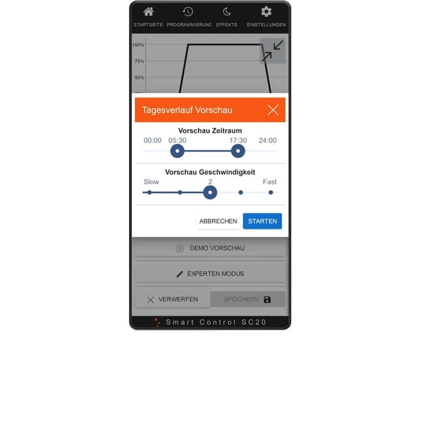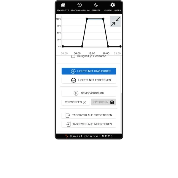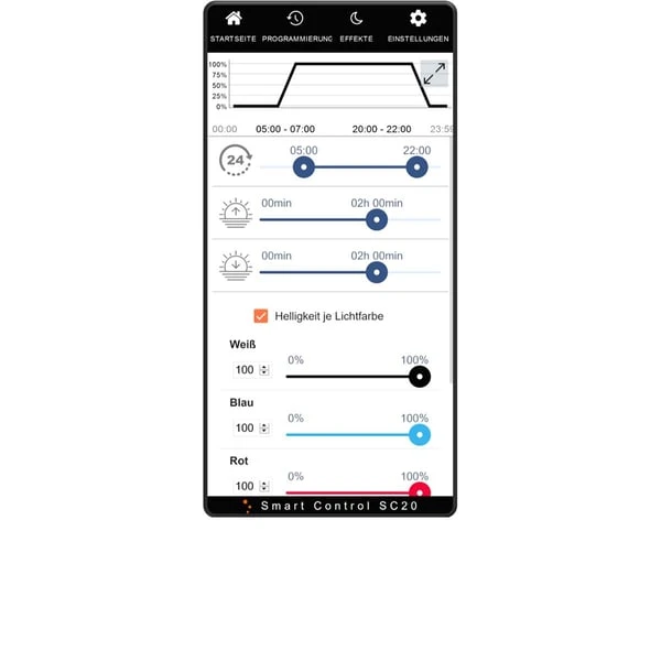 Schaffe mit der daytime Smart Control SC20 natürliche Lichtverhältnisse für Tag und Nacht. Die Programmierung und Steuerung erfolgt bequem mit dem Smartphone, Tablet oder PC. Du kannst die Verbindung einfach über das WLAN-Netzwerk und einen beliebigen Internetbrowser (z. B. Chrome, Firefox usw.) herstellen.