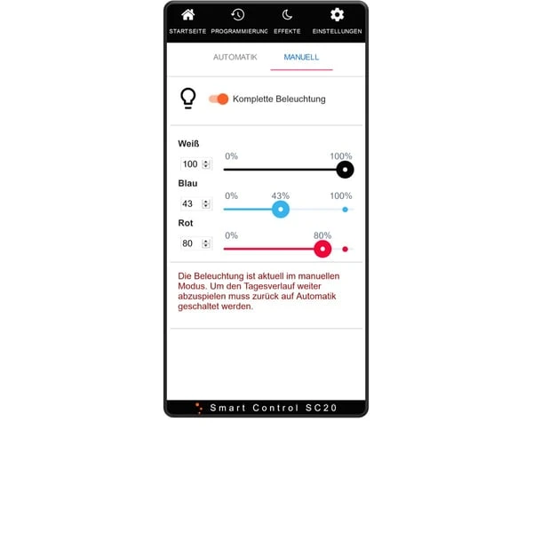 Manuelle Änderungen der Lichtverhältnisse in Echtzeit über Schieberegler „Slider“. Dimmung nahezu ohne „Sprünge“ über den gesamten Helligkeitsverlauf.