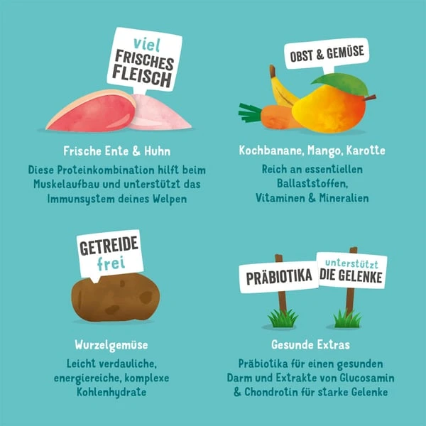 Reich an frischer Ente und Huhn aus Freilaufhaltung, ist diese getreidefreie Spezialität perfekt auf die Bedürfnisse von Welpen ausgerichtet. Es ist voll an hochwertigem, kalorienarmen Protein – das bedeutet kein getrocknetes oder entwässertes Fleisch. Dieses Futter enthält Präbiotika für einen gesunden Darm und wir fügen natürliche Extrakte von Glucosamin und Chondroitin für starke Gelenke hinzu. Wir bereiten unser Trockenfutter mit einem super gesunden Mix aus Obst und Gemüse sowie einer extra Portion Kräuter zu. Dann wird es schonend gegart, um all das Gute und den Geschmack zu erhalten. Hergestellt in Deutschland.