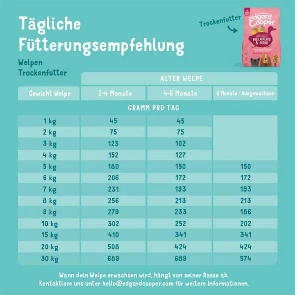 Tabelle separat bei den Abbildungen. Zusatz Info: Diese Tabelle ist nur ein Leitfaden, da jeder Hund einzigartig ist. Kontaktiere Edgard & Cooper für detailliertere Richtlinien. Dein Hund ist kein Kaktus, er liebt es, regelmäßig Wasser zu schlürfen. Achte also darauf, dass immer frisches Wasser zur Verfügung steht, besonders wenn du ihn fütterst.