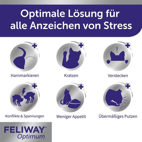 Dank der fortschrittlichen Botschaften im neuen Pheromon-Komplex, sorgt FELIWAY Optimum für mehr Ausgeglichenheit bei Katzen. Diese neue Entdeckung vermittelt deinen Katzen entspannende Botschaften, sowohl zum Wohlfühlen im Zuhause als auch für mehr Harmonie zwischen zusammenlebenden Katzen.