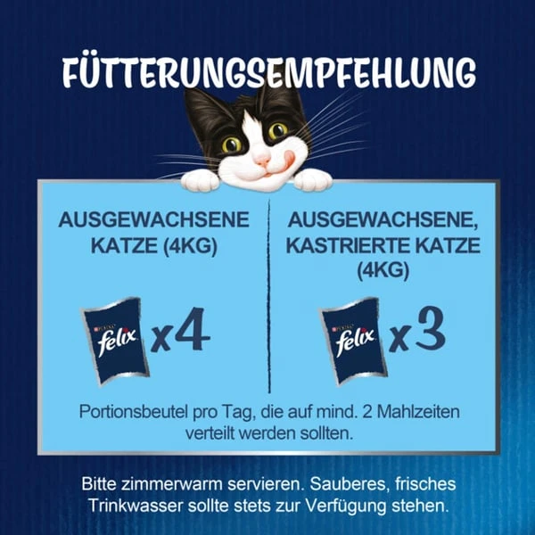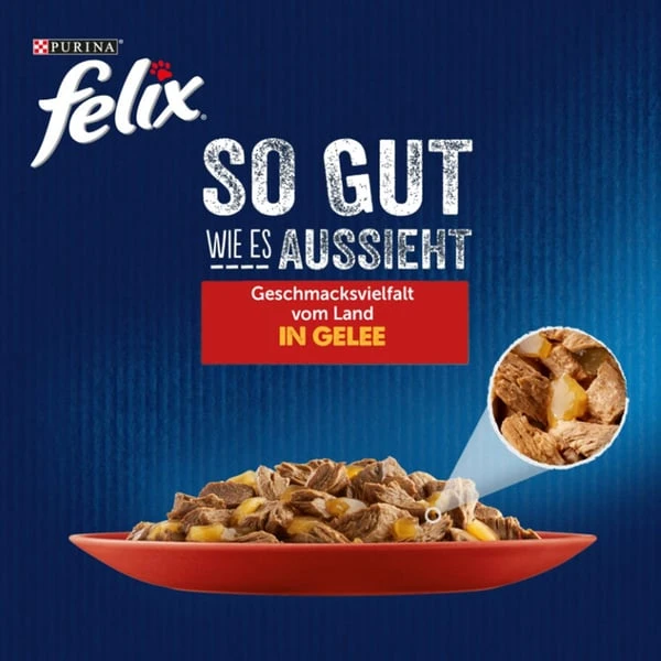 FELIX So gut wie es aussieht ist in einer großen Auswahl leckerer Sorten in saftigem Gelee erhältlich, um Ihrer Katze jeden Tag die Abwechslung zu geben, die sie liebt. Sie schmecken wirklich so gut, wie sie aussehen! FELIX – einfach unwiderstehlich! Unser FELIX Nassfutter für Katzen ist einfach unwiderstehlich!