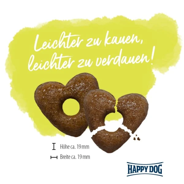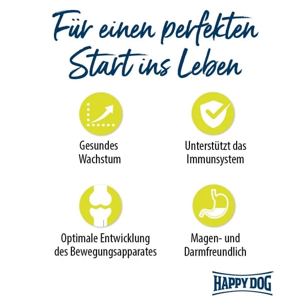 Ab dem 18. Monat sollte langsam auf ein Happy Dog Adult-Produkt, zum Beispiel „Neuseeland“, umgestellt werden. Hergestellt in Deutschland unter strengster Qualitätskontrolle.
