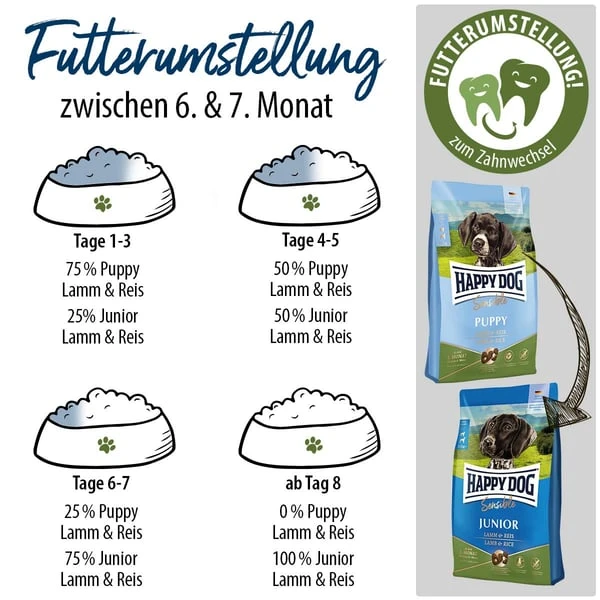 Ab dem 7. Lebensmonat solltest du deinen Welpen langsam auf Happy Dog Sensible Junior mit Lamm & Reis umstellen. Während der Junghundephase wächst dein kleiner Liebling langsamer und benötigt daher eine weniger gehaltvolle Nahrung.