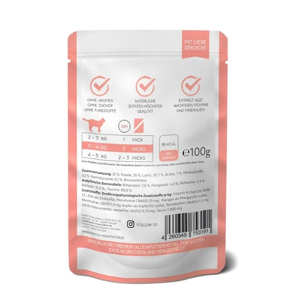 35%: Forelle, 35%: Lachs, 28,7%: Trinkwasser, 1%: Mineralstoffe, 0,2%: Nachtkerzenöl, 0,1%: Brunnenkresse