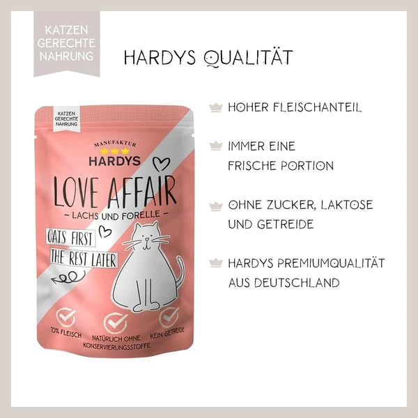 HARDYS Love Affair Spezialitäten werden sorgfältig hergestellt und zwar ausschließlich in Deutschland. Dabei verwenden wir bei HARDYS am liebsten heimische Zutaten die vitaminschonend gegart werden. Zartes hochwertiges Fleisch, wertvolle Innereien und die feine Portion Nachtkerzenöl versorgen Ihre Katze mit allen wichtigen Nährstoffen und Omega Fettsäuren.