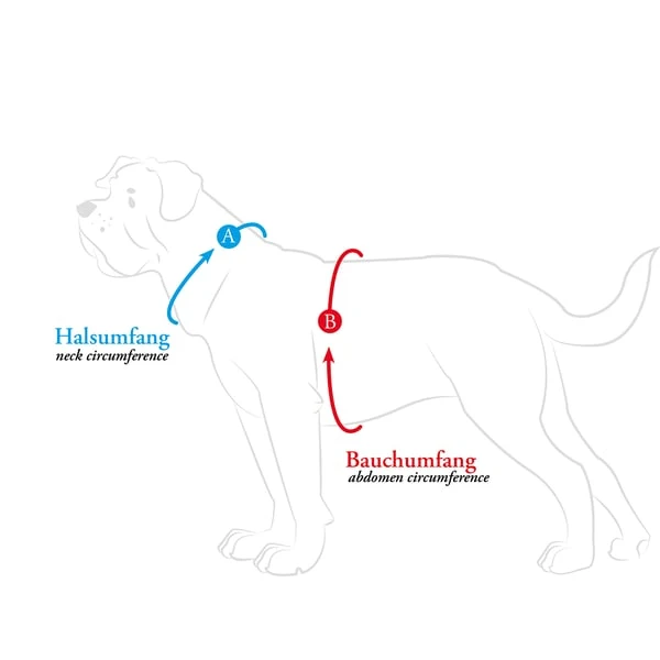 Idealerweise messen Sie den Bauchumfang (B) des Hundes knapp hinter den Vorderläufen an der breitesten Stelle des Brustkorbes mit einem flexiblen Maßband. Das Maßband sollte eng anliegen, den Hund aber nicht beengen. Etwa eine Fingerbreite Luft sollte zwischen Maßband und Hund bleiben. Anhand dieses Umfangs und der Berücksichtigung des Halsumfangs (A) kann die korrekte Geschirr-Größe ermittelt werden. In der Regel sind alle Geschirre mindestens am Bauch, meist aber auch mehrfach verstellbar und können zugunsten des Tragekomforts optimal an jede Körperform angepasst werden.