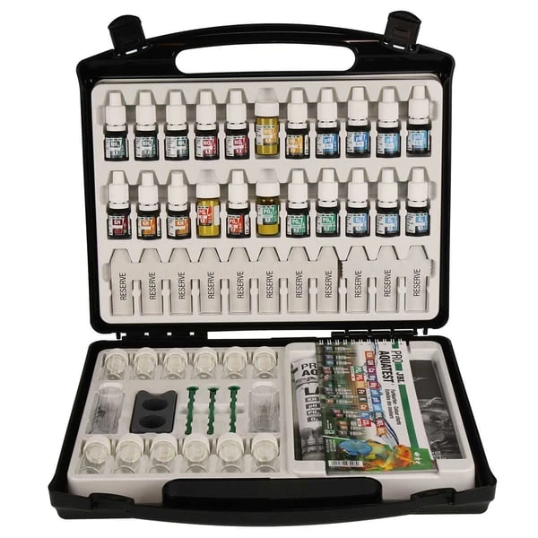 Professioneller Testkoffer für Wasseranalysen im Koi- und Gartenteich. Einfache und sichere Kontrolle der Wasserwerte von Teichen – Bestimmung von: pH 3,0 – 10, pH 7,4 – 9, Karbonathärte, Gesamthärte, Phosphat Sensitiv (niedrige Werte), Phosphat Koi (hohe Werte), Nitrit, Nitrat, Ammonium/Ammoniak, Sauerstoff. Einfache Anwendung: Spritze zur genauen Abmessung der Wassermenge, Ausführliche Gebrauchsanweisung. Komparatorsystem berücksichtigt Eigenfärbung des Wassers und macht Farbvergleich präziser. Mit professionellem Ammoniumtest, dessen Ergebnis über Tabelle (abhängig vom pH-Wert) den resultierenden Ammoniakgehalt zeigt. Kindersichere Reagenzflaschen, wasserfester Kunststoffkoffer, nachfüllbares Set. Lieferumfang: Testkoffer inkl. 22 Reagenzien, Glasküvetten, Spritzen, Dosierlöffel, Thermometer, Komparatorblock, Kunststoffküvetten, Farbkarten, Kugelschreiber, Protokollblätter und Anleitung.