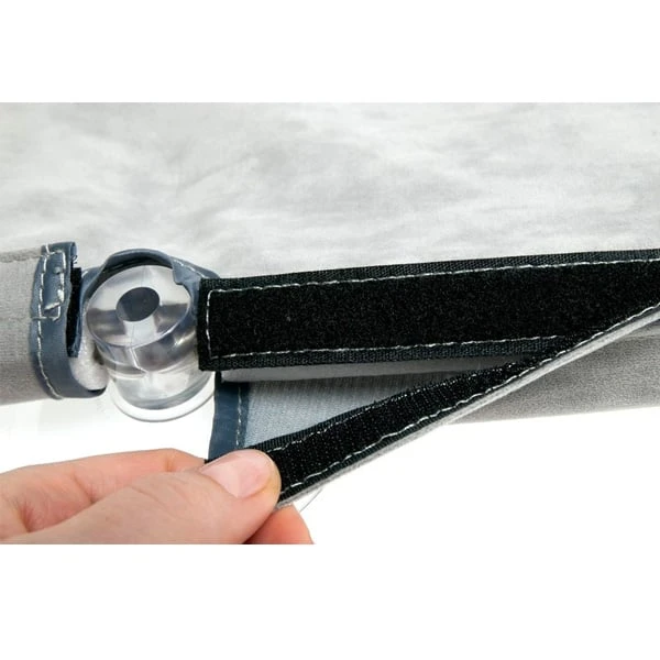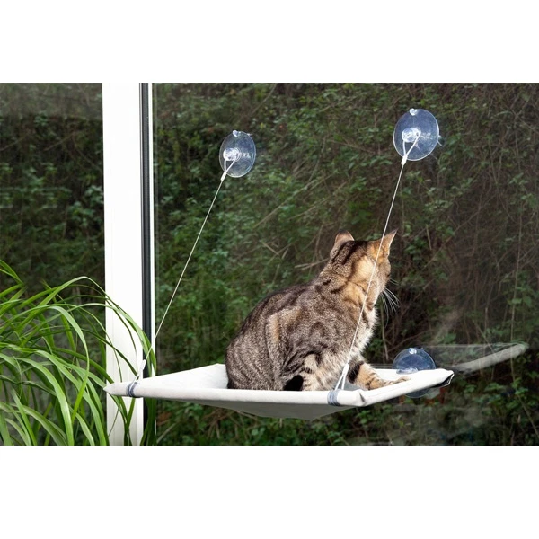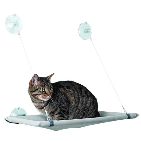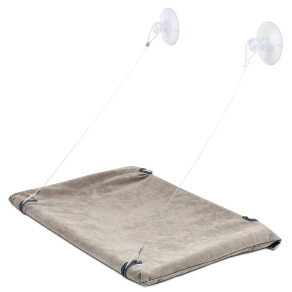 Mit dieser innovativen Hängematte können Sie Ihrer Katze einen tollen neuen Aussichtspunkt schaffen – an der Fensterscheibe, selbst ohne Fensterbank. Der Ruheplatz wird mit insgesamt vier Saugnäpfen an der Fensterscheibe befestigt (muss sauber sein für guten Halt) und kann beliebig versetzt werden – völlig ohne Werkzeug. Das graue Material ist per Hand waschbar und lässt sich dank Klettverschluss leicht vom Gerüst abnehmen. Für Katzen bis 12 kg geeignet.