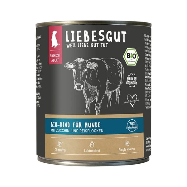 Für eine ausgewogene Mahlzeit deines Hundes kannst du mit Bio-Nassfutter sorgen. Mit Liebesgut Biokost Adult Hund mit Rind, Zucchini und Reis füllst du ein qualitativ hochwertiges Futter in den Napf. Die Zutaten besteht aus biologischen Zusammensetzungen. Dein Tier wird das einmalige Geschmackserlebnis des proteinreichen Rindes lieben. Das Futter ist speziell auf die Bedürfnisse von ausgewachsenen Hunden angepasst. Der hohe Fleischanteil und besonders versorgt den Organismus deines vierbeinigen Lieblings mit wichtigen Aminosäuren. Dieses proteinreiche Hundefutter eignet sich vor allem, um den Eiweiß- und Energiebedarf eines aktiven Hundes abzudecken. Zusätzlich liefert das enthaltene Herz viel hochwertiges Protein. Das Nassfutter beinhaltet nur eine tierische Proteinquelle und ist frei von Gluten und Getreide. Daher ist es besonders für ernährungssensible und zu Allergien oder Unverträglichkeiten neigenden Hunden geeignet. Die beigefügte Zutat Chiasamen gilt als Superfood, welche sich positiv auf die Gesundheit auswirken kann. Auf die Zugabe von Farbstoffen und Konservierungsmitteln wird zudem bewusst verzichtet.