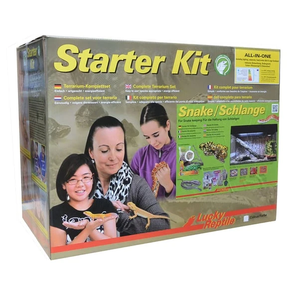 Für Schlangen bieten wir zwei unterschiedlich große Starter Kits an, die alles nötige Zubehör enthalten, was sich für die meisten gängigen Schlangenarten eignet. In erster Linie sind diese Terrarien für die Aufzucht von Jungschlangen gedacht, z.B. die 50 cm Variante für die beliebte Kornnatter oder die 80 cm Variante für eine Königspython, eine relativ kleinbleibende und zahme Riesenschlange. Es gibt aber auch Schlangenarten, die für eine Dauerhaltung im 80 cm Starter Kit geeignet sind. Einige gut verfügbaren und besonders attraktive Arten stellen wir in der beiliegenden Haltungsinformation vor. Ihr Fachhändler berät sich gerne bei der Auswahl, des für Sie passenden Tieres und eventuell zusätzlich notwendigem Zubehör.