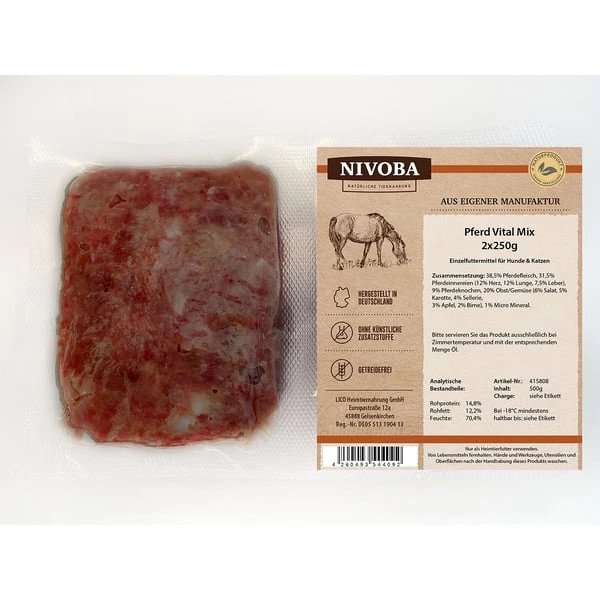 38,5 % Pferdefleisch, 31,5 % Pferdeinnereien (12 % Herz, 12 % Lunge, 7,5 % Leber), 9 % Pferdeknochen, 20 % Obst/Gemüse (6 % Salat, 5 % Karotte, 4 % Sellerie, 3 % Apfel, 2 % Birne), 1 % Micro Mineral