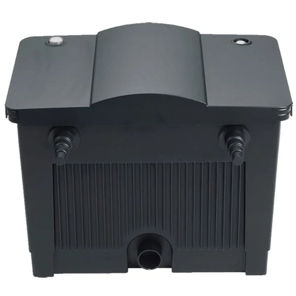 Der OASE BioSmart 36000 ist ein leistungsstarker Durchlauffilter (770 mm lang, 555 mm breit, 405 mm hoch) für Gartenteiche bis zu 36 m³ und Fischteiche bis zu 18 m³. 4 blaue und 4 rote Filterschwämme sowie 1 grüner Filterschwamm sorgen für eine optimale mechanische und biologische Filtrierung. Der Filter mit einer maximalen Durchflussmenge von 8.000 l/h verfügt über zwei Eingänge mit einer Universal-Stufenschlauchtülle von 1″ bis 1½“ und einen DN 75 Ausgang. Optimal kombinierbar mit OASE UVC-Vorklärgeräten Bitron C 24 und 36 W, sowie Vitronic 18-36 W. Zum Säubern hat der Durchlauffilter Reinigungshebel zum Ausdrücken der Filterschwämme, einen Bodenablauf und einen Klarspülanschluss.