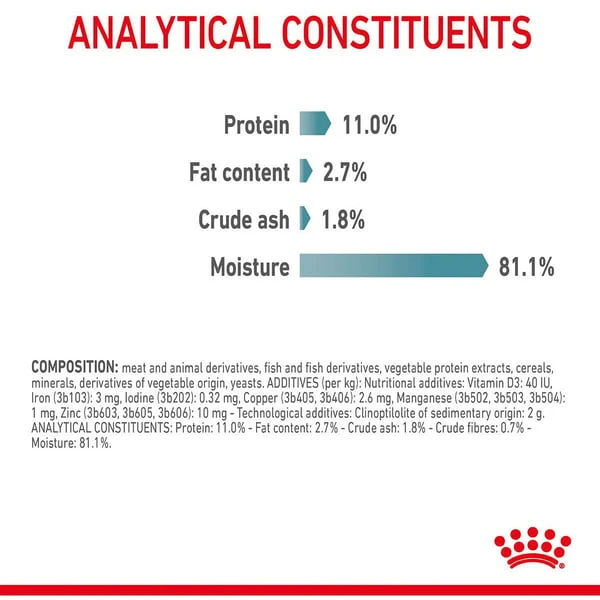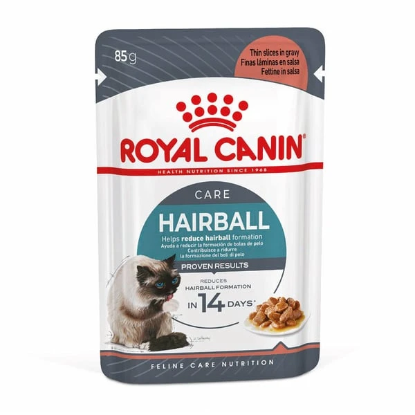 ROYAL CANIN® Hairball Care Feine Stückchen in Soße ist eine vollständige und ausgewogene Rezeptur, die speziell entwickelt wurde, um die Haarballenbildung zu reduzieren.