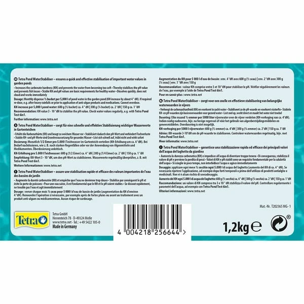 Tetra Pond WaterStabiliser gleicht die natürliche, kontinuierliche KH-Reduzierung im Teichwasser aus und beugt so zu weichem Wasser vor. Gerade nach längeren Regenfällen kann der KH-Wert stark absinken. Es stabilisiert auch den pH-Wert und verhindert auf diese Weise Fischverluste. Stabile KH- und pH-Werte sind eine Grundvoraussetzung für gesundes Wasser und das Wohlbefinden der Fische und aller Gartenteichbewohner. Außerdem sind stabile Wasserwerte häufig eine Voraussetzung für die Anwendung weiterer Teichpflegeprodukte. Tetra Pond WaterStabiliser löst sich schnell im Gartenteich auf, trübt das Wasser nicht und wirkt sofort.