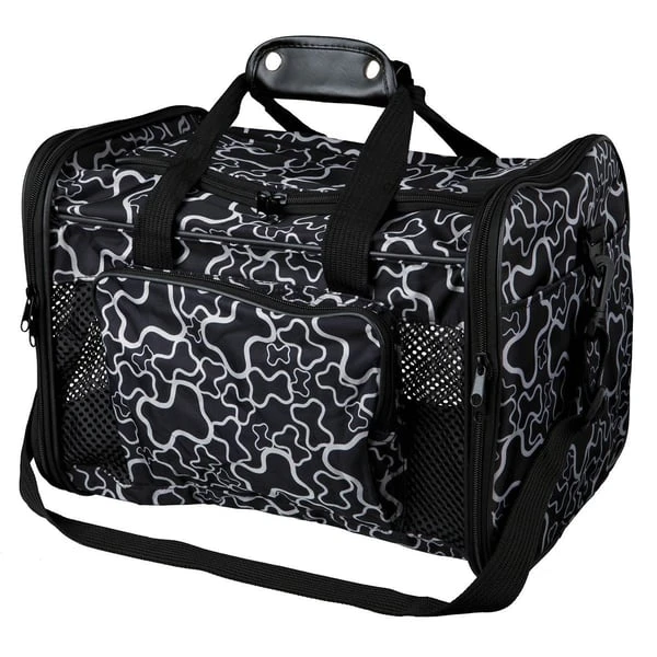 Die Transporttasche aus Polyester lässt sich gleichzeitig von drei Seiten öffnen: oben, vorne und hinten. An den Enden befinden sich jeweils Taschen, die zusätzlichen Stauraum schaffen. Für Tragekomfort sorgt der abnehmbare und stufenlos verstellbare Schulterriemen. Netzeinsätze an den Seiten sorgen für eine angenehme Luftzirkulation und die integrierte Kurzleine verhindert das Herausspringen. Die Bodenplatte ist mit Plüsch bezogen und herausnehmbar.