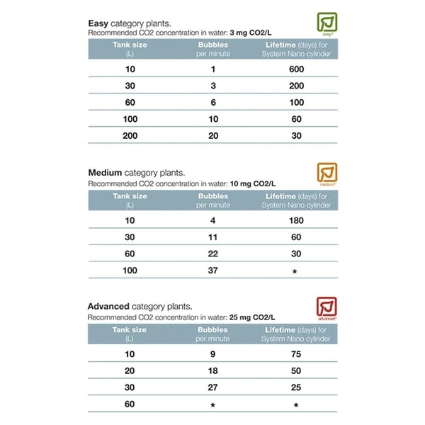 *) In einem großem Aquarium haben die Zylinder für System Nano eine kurze Lebensdauer bei CO2-Konzentrationen von 10-25 mg/L.